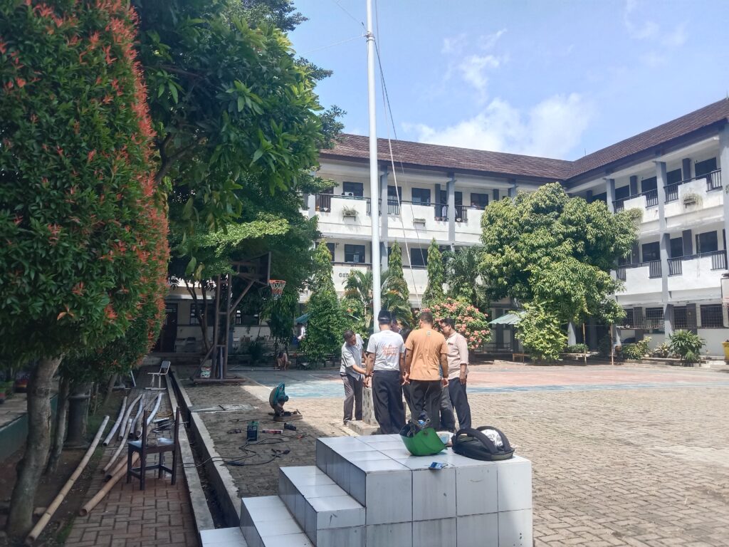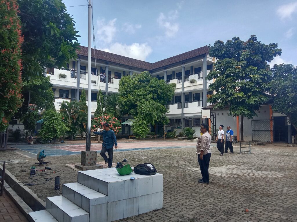 Pada hari ini dilaksanakan proses pemasangan tiang bendera disekolah yang sebelumnya selesai diperbaiki akibat kerusakan. Proses pemasangan ini dikerjakan oleh para guru dengan memperhatikan keamanan, kekuatan, serta posisi tiang agar dapat digunakan kembali untuk kegiatan upacara bendera.