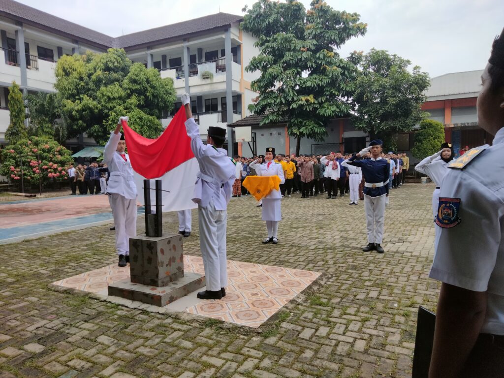 para petugas upacara dari pasukan pengibar bendera tengah melaksanakan tugas dengan penuh khidmat. Dua orang petugas berdiri tegak di depan tiang bendera, dengan posisi siap mengibarkan Sang Merah Putih yang dibentangkan dengan hati-hati. Di sisi lain, seorang petugas membawa baki berisi bendera dengan langkah tegap dan penuh wibawa, sementara peserta upacara berdiri rapi dan memberikan penghormatan.Kegiatan upacara ini bukan hanya sekadar rutinitas, tetapi juga bentuk penghormatan terhadap jasa para pahlawan dan simbol nasional Indonesia. Melalui kegiatan seperti ini, nilai-nilai kedisiplinan, tanggung jawab, serta rasa nasionalisme terus ditanamkan kepada generasi muda. Semangat gotong royong dan kebanggaan menjadi bagian dari bangsa Indonesia pun tumbuh subur di lingkungan sekolah ini